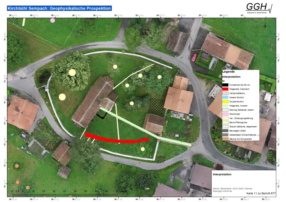 Die Messungen ergaben ein vorläufiges, aber spannendes Bild: Neue lineare Strukturen deuten auf mögliche Gräben oder ältere Wege hin, deren Bedeutung noch unklar ist. Bereits bekannte Befunde im Umfeld der Kirche konnten bestätigt werden – darunter auch ein möglicher alter Zugangsweg zur Kirche St. Martin.